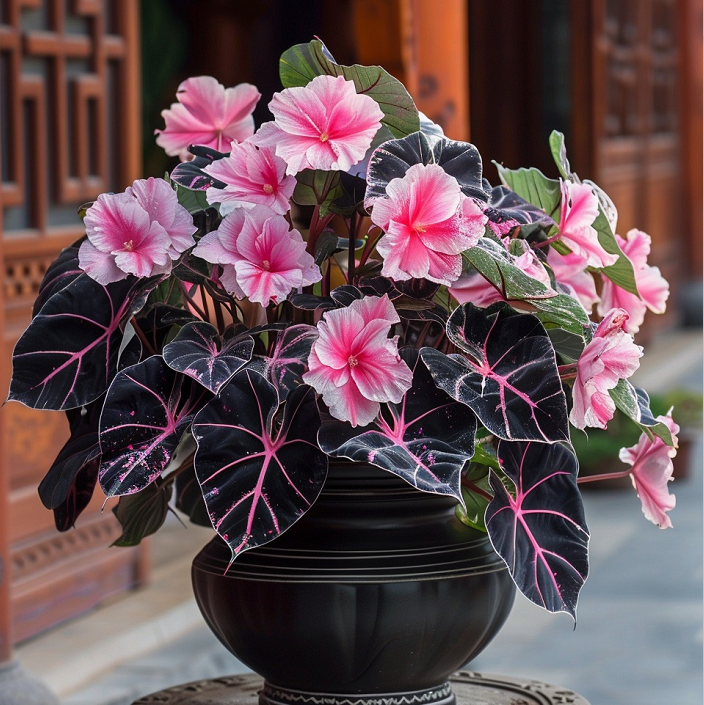 - Stunning Visual Contrast: The delicate. pastel pink flowers create a beautiful contrast against the rich. velvety black leaves of the Alocasia. highlighted by subtle pink veining. This combination elevates any room. making it a focal point in your plant collection. 🌈