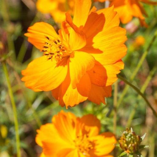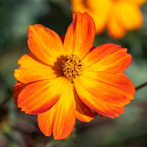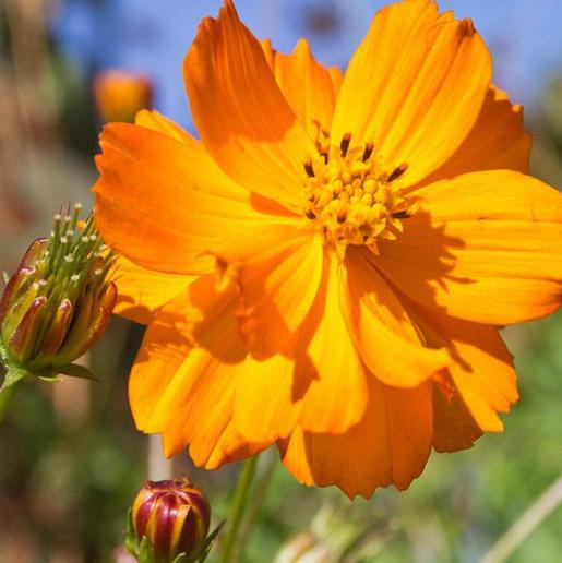 C. sulphureus. The intense dazzling yellow to reddish orange single flowers on this striking species Cosmos attracts bumblebees. birds. and beneficial insects. and looks terrific in a cut flower bouquet. Plant Bright Lights cosmos seeds in full sun. It's easy to grow in a variety of soils - tend towards the dry side. Its natural drought tolerance makes it a good candidate for xeriscaping. Plants grow to about 1m (3') tall. for the middle or front of a mixed border. Mix Bright Lights with dark blue and purple flowers for eye-catching contrast.