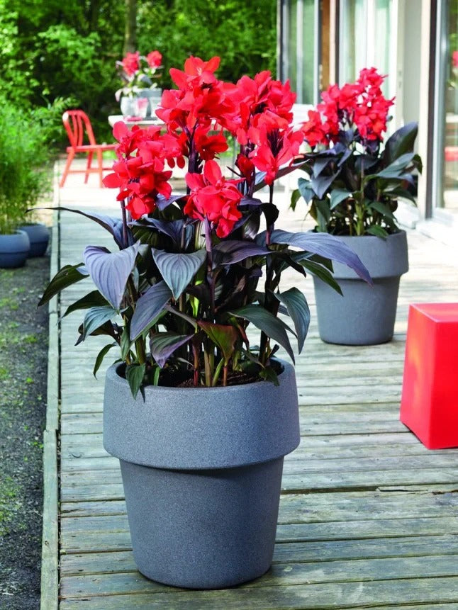 One of the impressive and striking extra-large canna lily varieties. Australia is a tropical beauty with dark foliage and bold vermilion flowers.