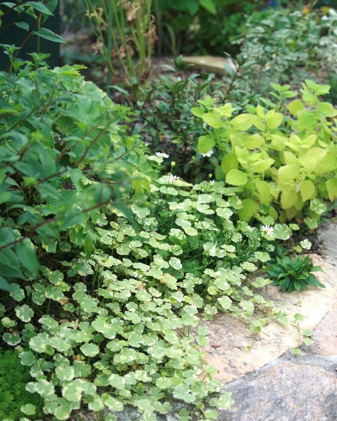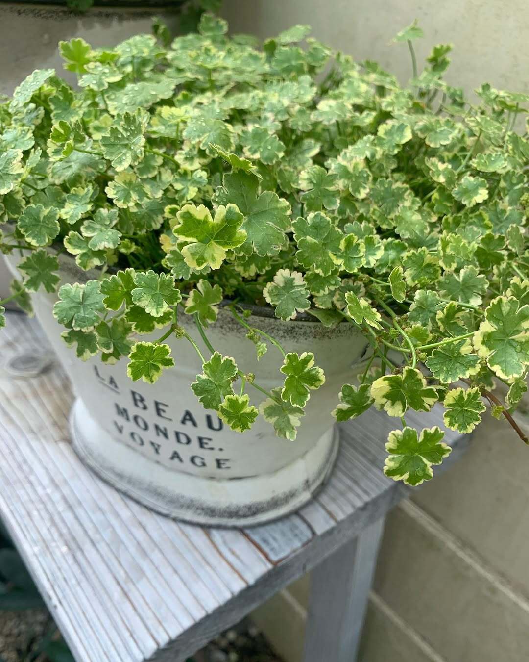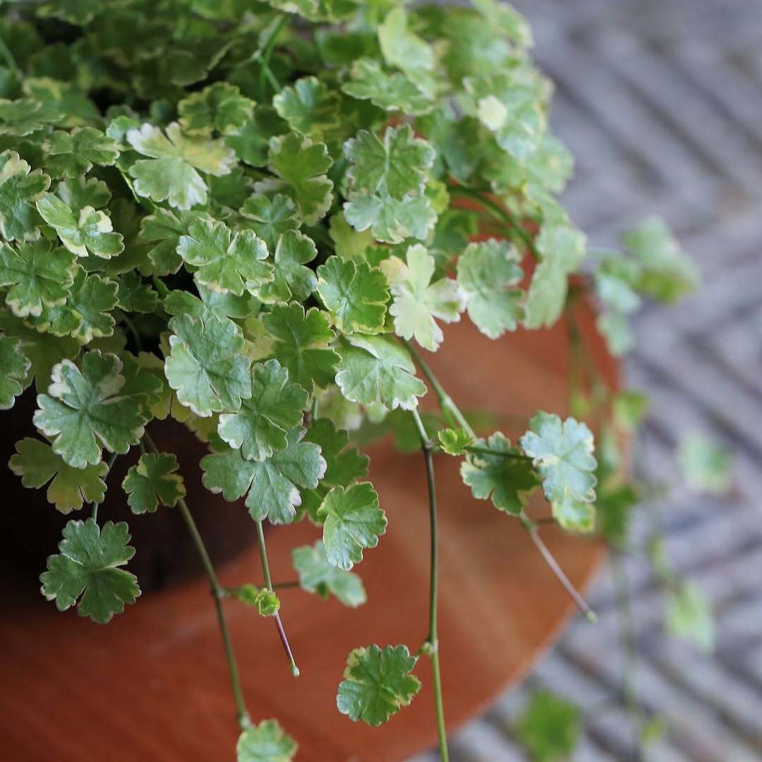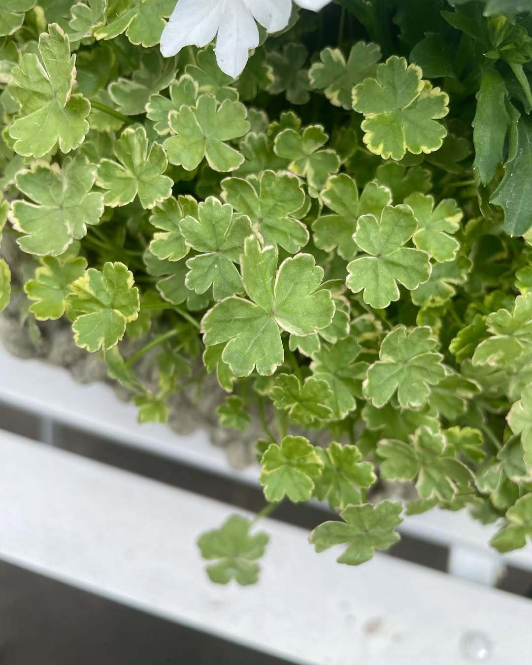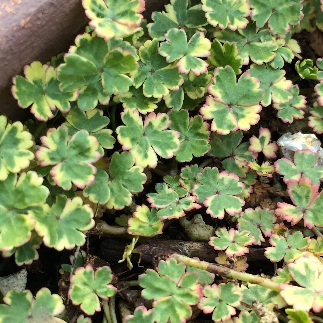 Variegated cilantro 'Crystal Candy' is a variegated variety of cilantro. It used to be a common weed. The variegated variety is more ornamental. with shiny light green round leaves with fine serrated white lace. Ground cover can grow in a moss-like form. It is a plant that likes moisture and can be used as a semi-aquatic plant. planted near the waterside to grow by the water.