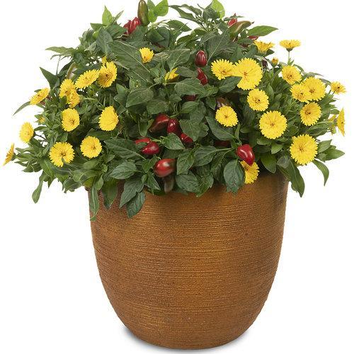 A hot pepper that works well in landscapes and containers. It may need trellising to maintain upright habit. Fruit transitions from geen to orange to red. with multiple colors represented on the plant at the same time. Fruits can be harvested when they begin to show good color and are fully ripe when solid red. Taste is pleasing if picked before full maturity. If you are growing this plant in a container. a 12" diameter (3 gallon volume) is the minimum necessary size. The ideal size would be a 14" to 18" (5-7 gallon) container.