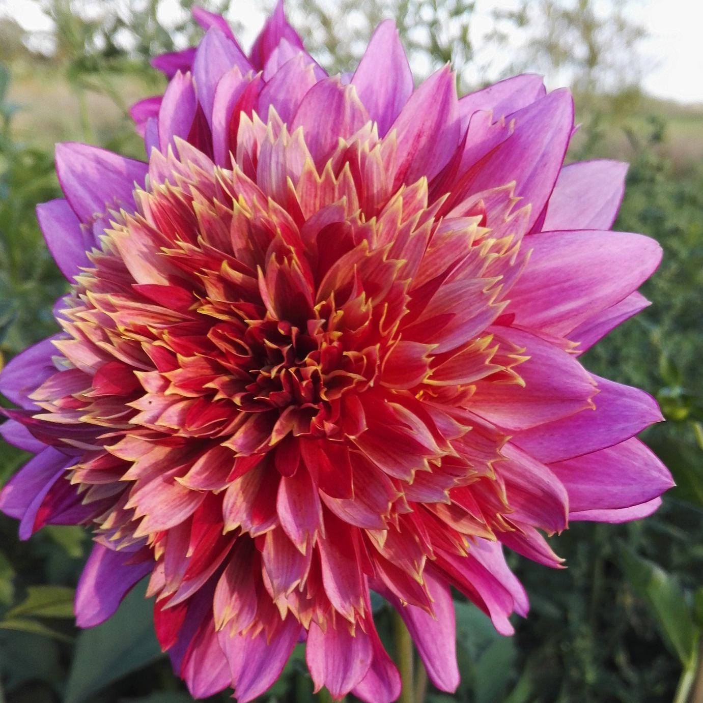 'Myrtle's Folly' is a large frizz ball of raspberry and golden twisted petals with an 8” flower. She is a super unique fully double cactus type dahlia.