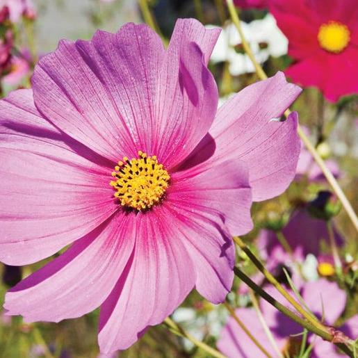 Cosmos bipinnatus. Reliable and well-loved single daisy shaped flowers with yellow centers bloom in white and various shades of pink. Pinching off the growing tip when the plant is about 15cm (6") tall will help keep this tall lacy plant bushy and erect. Do not overfeed. as rich soil will delay flowering. Sensation Mix cosmos seeds plant height 1.2-1.8m (4-6'). Stake these tall Cosmos in windy gardens. but in sheltered areas. this is not necessary. Deadhead (remove spent flowers) to extend the flowering period and keep plants looking their tidiest. Cosmos is quite drought tolerant so it makes a good candidate for xeriscaping. Provide some water in extreme drought. Sensation Mix won an AAS Award in 1936.