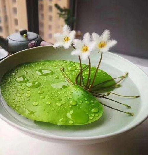Its plant body resembles the leaves of a water lily. or a giant duckweed. round and green. with a slit reaching the center of the leaf. but it is smaller and more delicate than the water lily: the whole plant has only one leaf. Floating in a bowl of clean water. white flowers bloom in the center of the leaves. If you show interest. the florist will enthusiastically introduce to you that this plant is called "one-leaf lotus". It has only one leaf and only needs to be placed in clear water to bloom.